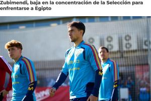 马丁·苏维门迪因右膝不适退出西班牙国家队集训。为避免任何风险并保障球员健康,他已被移出球队下一场对阵埃及的名单。阿森纳足球俱乐部医疗团队已获悉此事。