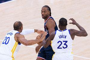 快船也是同一思路,琼斯领防库里,小卡对位铂金,大洛对位追梦——放空追梦三分,并且一旦库里+铂金挡拆会被琼斯/小卡换防化解,防库里+追梦挡拆则先派大洛夹击再弱侧轮转补中路,夹库里鼓励其他人终结。