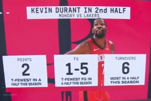 破不了夹击!杜兰特2助7失误 下半场仅在垃圾时间得2分!